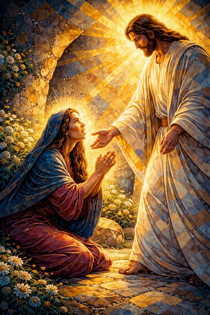 ✨ Prophecy Fulfilled: The Life of Yeshua (Jesus) “Mary.” Peter and John had left. The linen wrappings remained. The tomb stood open. The morning air still carried confusion and awe. But Mary Magdalene stayed. John tells us simply: “But Mary stood weeping outside the tomb.” (John 20:11) She had seen the cross. She had watched Him die. She had come before sunrise to honor a body. Now even the body was gone. Through tears she stooped to look into the tomb, and she saw two angels in white, sitting where the body of Yeshua had lain — one at the head, one at the feet (John 20:12). They asked her gently: “Woman, why are you weeping?” (John 20:13) Her answer was heartbreak itself: “They have taken away my Lord, and I do not know where they have laid Him.” She turned. And saw Him. But she did not know it was Him. Resurrection stood before her, and grief blinded her eyes. Yeshua asked: “Woman, why are you weeping? Whom are you seeking?” (John 20:15) Supposing Him to be the gardener, she pleaded for the body. Then He spoke one word. “Mary.” (John 20:16) Not a sermon. Not a proclamation. Her name. And in that instant, recognition shattered grief. “Rabboni!” — Teacher. The first person to see the risen Messiah was not a ruler. Not a priest. Not a Roman official. It was a woman once delivered from seven demons (Luke 8:2). A woman who stayed when others fled. A woman who wept when others went home. Resurrection was revealed to the faithful. Yeshua told her: “Do not cling to Me, for I have not yet ascended to the Father. But go to My brothers and say to them…” (John 20:17) Mary became the first witness. The first evangelist of the resurrection. She went and announced: “I have seen the Lord.” (John 20:18) ⸻ This moment changes everything. The resurrection is not merely an empty tomb. It is a personal call. He speaks names. ✝️ Continued in Comments ⬇️⬇️⬇️ #Jesus #Resurrection #Bible #Salvation #Help #Love #Atheism #Gnosticism