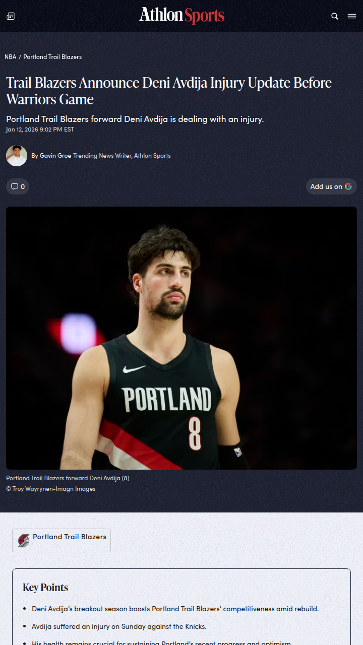 Brian Gaines+FollowDeni Avdija’s breakout season hits a snagDeni Avdija has been the spark the Trail Blazers needed, turning heads with his all-around game and making a real case for Most Improved Player. Averaging over 26 points, 7 rebounds, and nearly 7 assists, he’s become the heartbeat of Portland’s rebuild. But just as fans were getting excited, Avdija’s lower back soreness has sidelined him for the next game. With his health now a concern, it’s a big test for both Avdija and the Blazers. How do you think Portland should handle his minutes moving forward? #Sports #Basketball #RipCity00Share