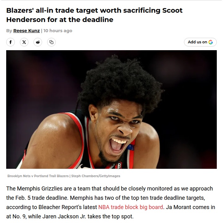 Oscar Gonzalez+FollowShould Blazers Trade Scoot for JJJ?Blazers fans, would you go all-in and move Scoot Henderson for Jaren Jackson Jr. if Memphis blows it up at the deadline? JJJ’s defense and fit next to Deni Avdija could make Portland a playoff threat, but giving up a young talent like Scoot is a big call. With Dame possibly returning, is this the right move for Rip City’s timeline? Let’s hear your takes! #Sports #Basketball #RipCity10Share
