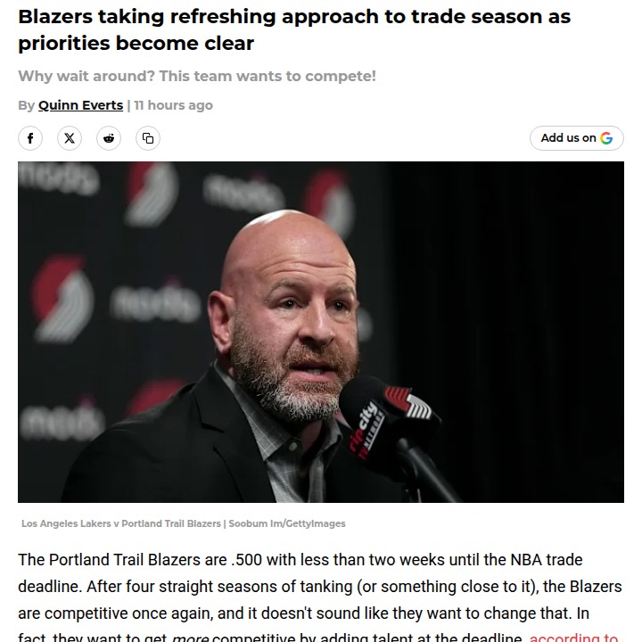 Ryan Lopez+FollowBlazers fans buzzing as Portland eyes playoff pushPortland’s front office is flipping the script this trade season—no more tanking, just a real shot at winning. With the Blazers sitting at .500 and the deadline looming, word is they’re looking to add real talent instead of selling off assets. Joe Cronin’s bold moves have already made him a fan favorite, and another smart trade could supercharge this surprise season. If they can boost the roster without losing core young players, why not go for it? The city’s hungry for playoff basketball again—what kind of move would you want to see? #Sports #Basketball #RipCity00Share