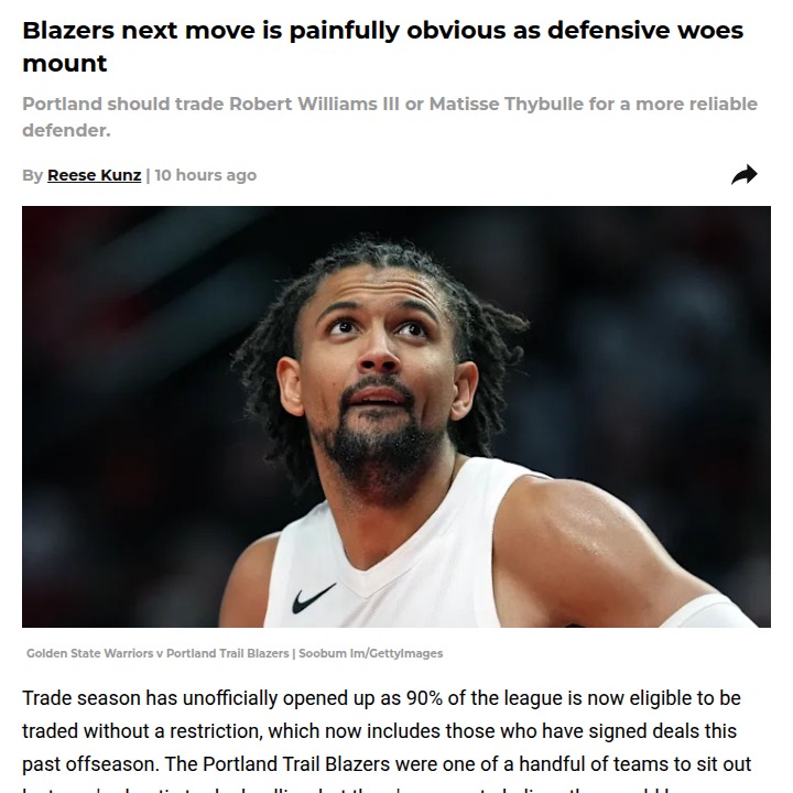 Ryan Lopez+FollowPortland’s defensive identity is missingPortland fans, it’s wild how quickly the Blazers’ defensive edge has disappeared this season. Just months ago, they were a top-10 defense, but now they’re sitting near the bottom of the league, giving up way too many points. Injuries to key defenders like Williams and Thybulle haven’t helped, and with their contracts expiring, it might be time to trade them for more reliable, long-term pieces. Do you think the Blazers should move on from these defensive specialists, or is there still hope they can turn things around if healthy? Let’s hear your take! #Sports #Basketball #RipCity00Share