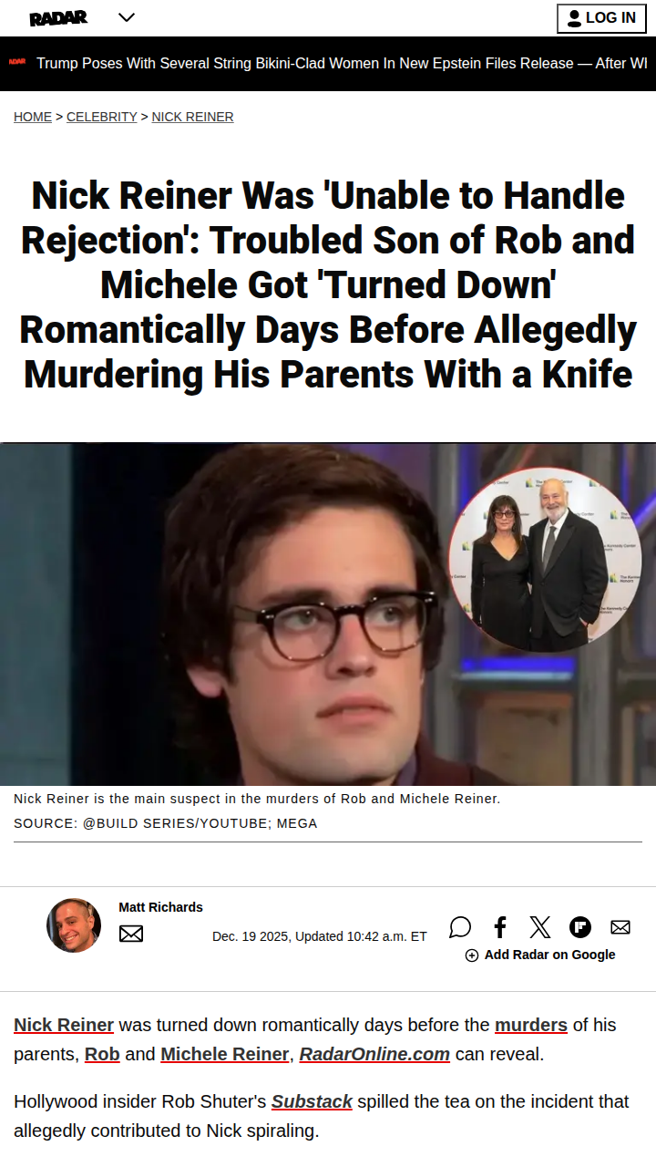 Chad Kemp+FollowRob Reiner family tragedy shocks HollywoodThe Reiner family is reeling after the shocking deaths of Rob and Michele Reiner, allegedly at the hands of their son Nick. Insiders say Nick struggled with rejection and isolation, and his inability to connect with others may have played a role in this heartbreaking event. Friends describe him as overbearing and unable to read social cues, which pushed people away and deepened his loneliness. This tragedy is sparking tough conversations about mental health, substance abuse, and the pressures of living in the public eye. How can communities better support those who feel isolated before things spiral out of control? #Entertainment #Celebrity #RobReiner20Share