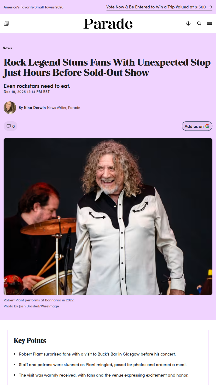 Courtney Brennan+FollowRock legend Robert Plant surprises GlasgowRobert Plant, the iconic voice of Led Zeppelin, casually dropped into Buck's Bar in Glasgow just hours before his sold-out concert, leaving everyone in the place absolutely buzzing. Imagine sitting down for a meal and suddenly a rock legend walks in, orders food, and chats with staff like it’s no big deal. The best part? He took time for photos and left everyone with a story they’ll never forget. It’s moments like these that remind us how music legends can still make real, personal connections. If you were there, what would you have said to him? #Entertainment #Music #RobertPlant20Share