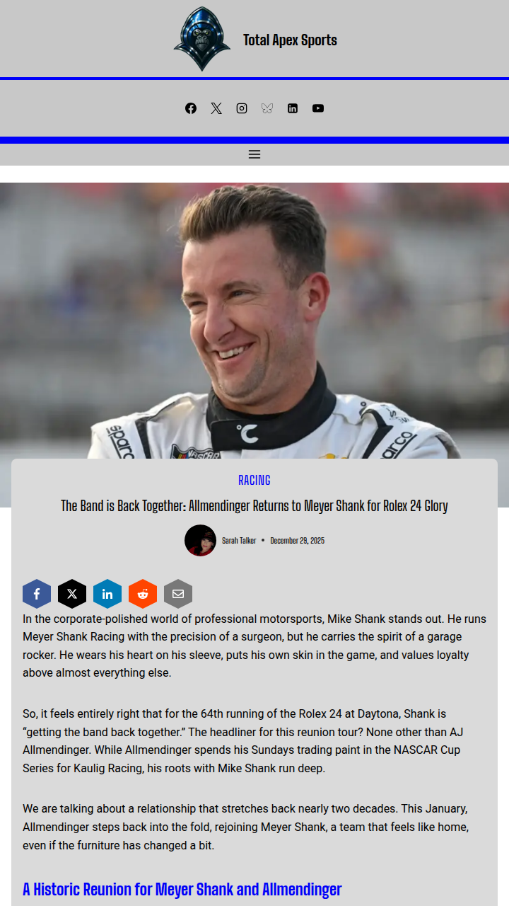 Jason Smith+FollowAllmendinger & Shank: Rolex 24 ReunionAJ “Dinger” Allmendinger is reuniting with Mike Shank and the Meyer Shank Racing crew for the Rolex 24 at Daytona! This isn’t just a nostalgia play—Dinger’s back where he scored that epic 2012 win, but now he’s got to tame the wild Acura ARX-06 GTP. With legends like Scott Dixon and Tom Blomqvist on the squad, the pressure’s on. Can the old band rock the new era and add another chapter to their legacy? #Sports #Racing #Rolex2400Share