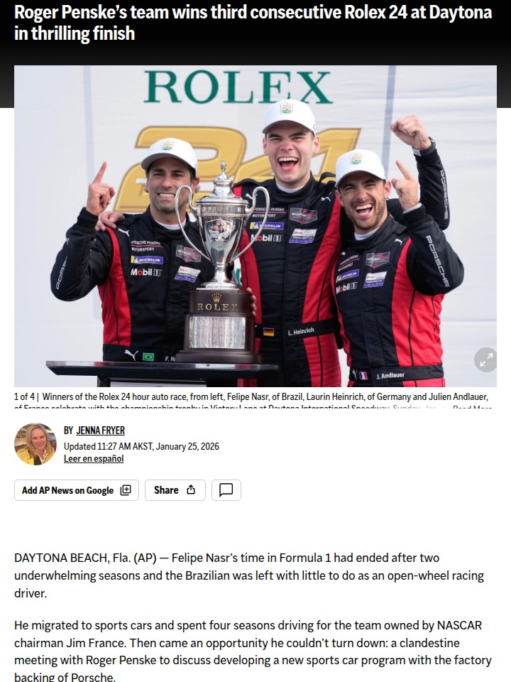 Karla Young+FollowPenske’s Porsche clinches third straight Rolex 24Three years, three different driver lineups, and still unbeatable—Roger Penske’s Porsche team just pulled off a rare three-peat at the Rolex 24 at Daytona! Felipe Nasr, the only constant across all three wins, fended off a hard-charging Cadillac in front of the biggest crowd the race has ever seen. This victory not only cements Penske’s legacy but also marks Porsche’s 21st win at Daytona. With the motorsports season now officially underway, what do you think makes a team so consistently dominant in such a grueling race? Let’s hear your thoughts on this epic endurance showdown! #Sports #Racing #Rolex2410Share