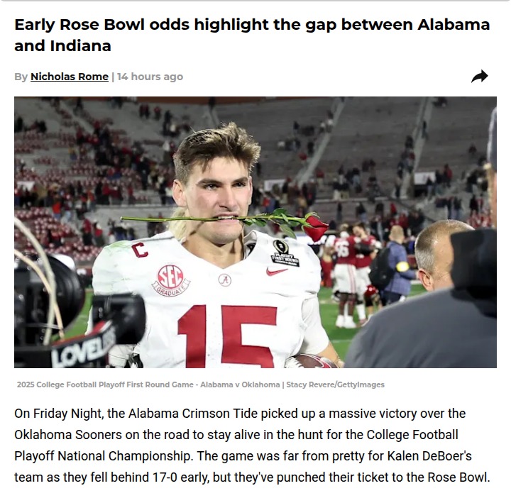 Christopher Hughes+FollowRose Bowl Odds: Hoosiers Favored Over BamaCan you believe the early Rose Bowl odds? The oddsmakers have Indiana as a 6.5-point favorite over the Crimson Tide! King Kalen and Bama barely survived the Sooners, but now they face Curt Cignetti’s nearly flawless Hoosiers. The big question: will Indiana’s long layoff cool them off, or will Bama’s battle-tested squad close the gap? This matchup is wild considering Bama’s blue blood status. Let’s hear your predictions! #Sports #Football #RoseBowl00Share