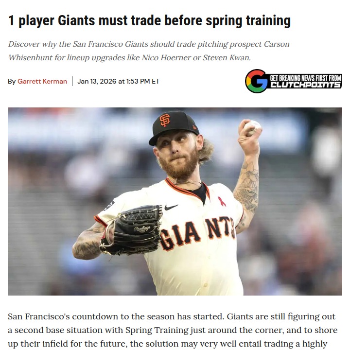 Catherine Reeves+FollowWhy the Giants should trade Carson Whisenhunt nowSan Francisco’s infield puzzle could finally get solved if the Giants make a bold move before Spring Training—by trading top pitching prospect Carson Whisenhunt. It’s a tough call, but the team’s need for a reliable second baseman is real, and Whisenhunt’s value is sky-high right now. Swapping him for a proven infielder like Nico Hoerner or even a versatile outfielder like Steven Kwan could give the Giants the stability they’ve been missing. Would you risk a promising arm for a shot at a steadier lineup? Let’s hear your take! #Sports #Baseball #SFGiants00Share