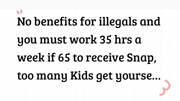 American Patriot +FollowNo benefits for illegals and you must work 35 hrs a week if 65 to receive Snap, too many Kids get yourself spayed!!! #SNAPBenefits #SNAPLife #SNAPTalk00Share