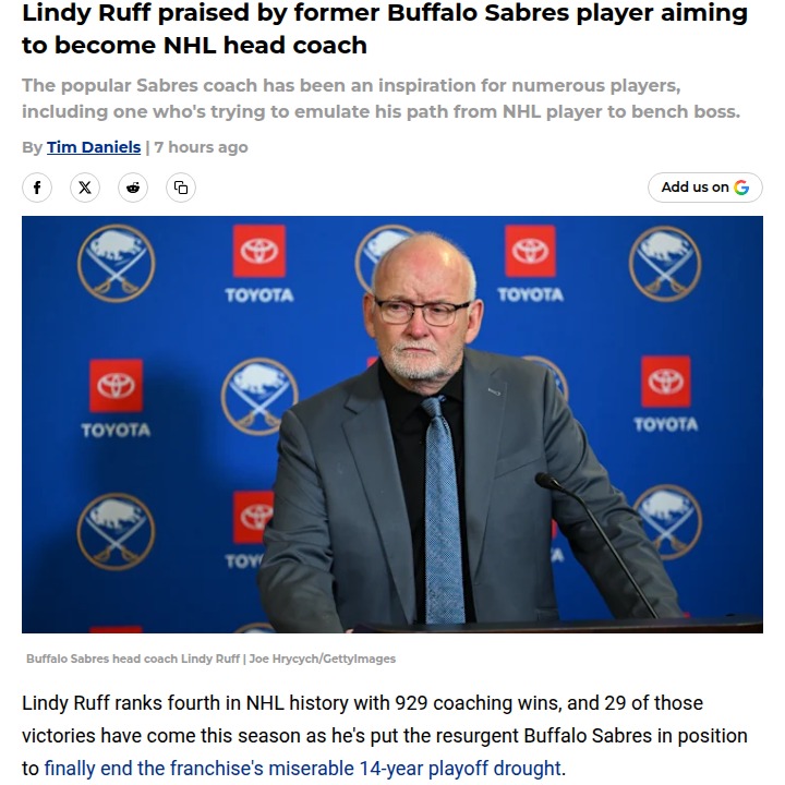Sherri West+FollowSabres’ Ruff Sets Record, Ott Eyes Next StepLindy Ruff, the Sabres’ bench boss and franchise legend, just hit his 929th NHL coaching win—fourth all-time! With Buffalo on a playoff push, former Sabres grinder Steve Ott is taking notes as he starts his own head coaching journey in the AHL. Could Ott be the next in line for the Blue and Gold if Ruff ever steps aside? The Sabres’ future behind the bench is getting interesting! #Sports #IceHockey #Sabres00Share