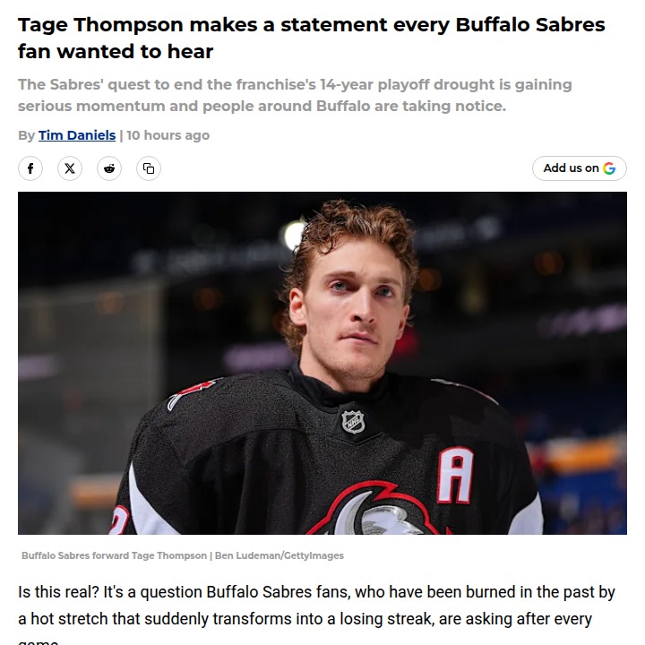Martha Garza+FollowBuffalo’s playoff hopes feel real this timeTage Thompson just put on a show Sabres fans won’t forget—netting a hat trick and five points in a crucial win over Montreal. But what really stands out is the vibe in the locker room: Thompson says this is the most fun he’s had in Buffalo, and the team’s confidence is sky-high. With 15 wins in their last 17 games and the top wild-card spot in the East, Buffalo’s long-suffering fans are daring to believe again. Is this the year the Sabres finally break through? What do you think has changed most for this team? #Sports #IceHockey #Sabres00Share