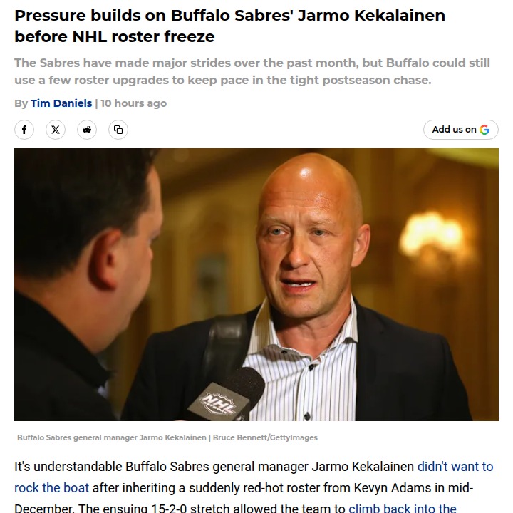 Jordan Leblanc+FollowSabres’ playoff hopes hinge on bold movesBuffalo’s playoff dreams are on the line as the Sabres’ hot streak has cooled, and the pressure is mounting on GM Jarmo Kekalainen to shake up the roster before the NHL’s Olympic trade freeze. With the East getting tighter and rivals making big trades, standing pat could mean missing out—again. Fans remember last season’s inaction and don’t want a repeat. Whether it’s landing a top forward or shoring up the defense, something’s got to give. What kind of move do you think could spark the Sabres back to life? #Sports #IceHockey #Sabres00Share