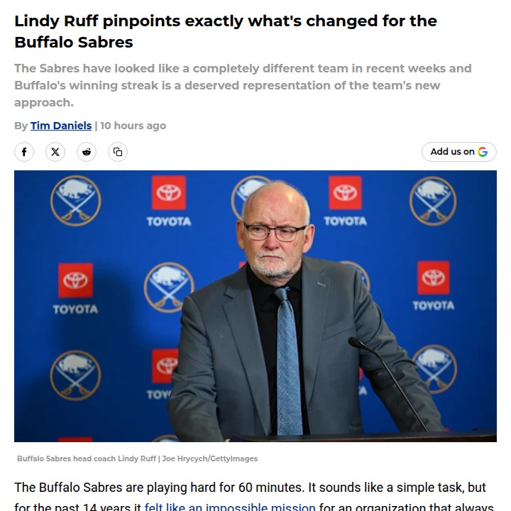 stacy28+FollowSabres’ grit fuels historic winning streakBuffalo Sabres fans are finally seeing a team that refuses to quit—no matter the score or the opponent. Under new GM Jarmo Kekalainen and coach Lindy Ruff, the Sabres are battling for every puck and playing with real desperation, like when rookie Noah Ostlund blocked a shot late in a 4-1 win over Dallas, even with the game in hand. Tage Thompson’s hot streak and Ukko-Pekka Luukkonen’s stellar goaltending have helped Buffalo tie its longest winning streak ever. If this energy keeps up, the Sabres’ playoff drought could be over. What’s your take: Is this the year Buffalo finally breaks through? #Sports #IceHockey #Sabres00Share