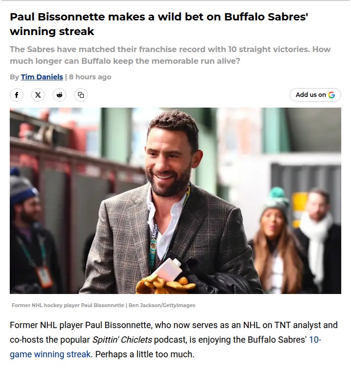 Molly Tucker+FollowSabres’ streak has Buffalo buzzingBuffalo’s hockey fans haven’t felt this electric in years—the Sabres just notched their 10th straight win, and the city’s energy is off the charts. Even Paul Bissonnette, the outspoken NHL analyst, is so hyped he’s joking about buying a buffalo if the streak hits 20. With the team finally playing tough, smart hockey and climbing the standings, it feels like something special is brewing. The upcoming schedule isn’t a murderers’ row, so could this be the year Buffalo finally breaks its playoff drought? What’s your take—are you cautiously optimistic or all-in on this run? #Sports #IceHockey #Sabres00Share