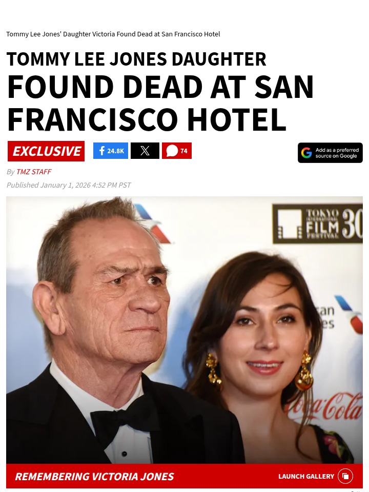 Gina Reynolds+FollowShock in San Francisco: Tommy Lee Jones’ daughter diesThe San Francisco community woke up to heartbreaking news—Victoria Jones, daughter of actor Tommy Lee Jones, was found dead at the Fairmont Hotel on New Year’s Day. At just 34, Victoria’s sudden passing has left many stunned, especially since no foul play or self-harm is suspected. She grew up in the spotlight, even acting alongside her father, but stepped away from Hollywood as an adult. The cause of death is still unknown, and the Jones family hasn’t spoken publicly yet. How do you think celebrity families cope with tragedy under such public scrutiny? #Entertainment #Celebrity #SanFrancisco80Share
