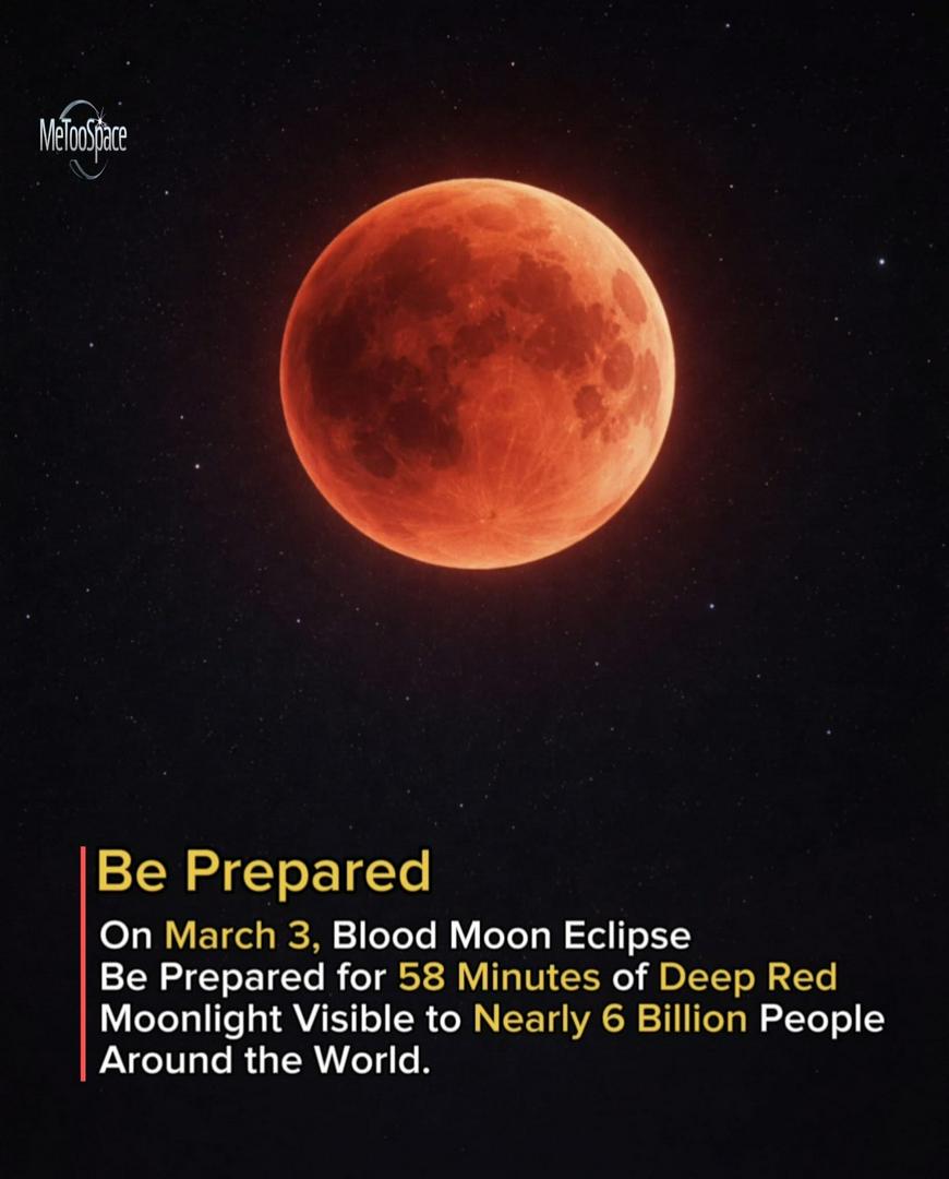 🌕 March 3 Blood Moon Eclipse: Be Prepared for 58 Minutes of Deep Red Moonlight On March 3, skywatchers around the world will witness a breathtaking Blood Moon eclipse, as the Moon turns a deep red color for about 58 minutes during totality. This happens during a total lunar eclipse when the Earth moves directly between the Sun and the Moon, casting a shadow that filters sunlight and gives the Moon its dramatic red glow. Nearly 6 billion people across different continents will have a chance to see this rare event with the naked eye, weather permitting. No special equipment is needed just look up at the night sky at the right time. It’s a perfect moment to gather with family, take photos and experience one of nature’s most beautiful celestial events. Don’t forget to check your local timing and be prepared to enjoy this unforgettable red Moon spectacle! #space #science #fact #facts