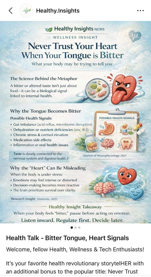 BREAKING HEALTH SIGNAL Bitter Tongue? Your Body May Be Sending a Stress Warning. A division of Healthy Insights | Wellness Alert A persistent bitter taste in your mouth may not just be about food. It may be a biological signal. Emerging research continues to show that taste perception is closely connected to: • Nervous system activity • Digestive health & microbiome balance • Hormonal stress response (cortisol elevation) • Nutrient status (zinc, B12) • Medication interactions When flavor shifts… internal systems may be shifting too. Under stress, the body prioritizes survival over clarity. That means: • Emotions intensify • Decisions become reactive • Perception distorts A “bitter” body state can create a “bitter” emotional lens. Before you make a major emotional decision, ask: Is this clarity or cortisol? What Could Be Causing It? Common triggers behind persistent bitter taste include: • Dehydration • Acid reflux / gut imbalance • Zinc or B12 deficiency • Chronic stress • Medication side effects • Oral inflammation Your mouth is not separate from your health system. It is part of your diagnostic story. Taste receptors communicate directly with the brain and digestive tract. When internal equilibrium shifts, sensory perception shifts. Your body whispers before it escalates. If you notice persistent bitterness: • Hydrate consistently (aim for ~8 glasses daily) • Support gut health with fiber + probiotics • Review recent medication changes • Replenish key micronutrients • Evaluate emotional stress load And if symptoms persist, consult a healthcare professional. When your body feels “bitter”: Pause. Regulate first. Decide later. Follow @healthyinsightsnews for science-backed signals. #Thesignalwire #getinspired #healthyinsights #science #healthy #HealthNews #BreakingNews #WellnessAlerts