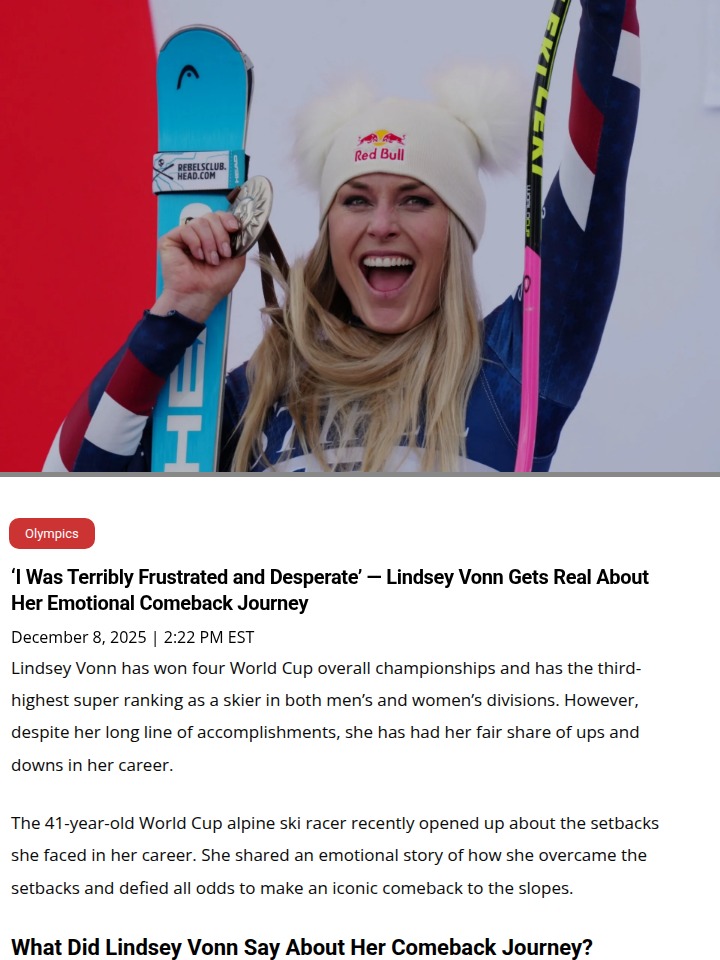 Dawn Fritz+FollowVonn’s Comeback: Queen of the Slopes Rises AgainLindsey Vonn, aka the Queen of the Slopes, just proved age is just a number! After a brutal injury and a six-year break, she came back with a vengeance, grabbing 2nd in the Super-G at Sun Valley and becoming the oldest woman to podium in a World Cup. Her honesty about frustration and doubt makes this comeback even more epic. Anyone else inspired to never count out a legend? #Sports #LindseyVonn #Skiing20Share
