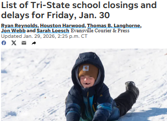 Jorge Figueroa+FollowSnow day surprises: Evansville schools closedEvansville and much of the Tri-State are waking up to a rare winter shutdown—schools across the area are closed or delayed after last weekend’s massive storm. For families, this means a sudden change of plans: kids at home, parents scrambling for childcare, and a bonus day off for some. Notably, Evansville Vanderburgh schools will make up the missed day in April. How’s everyone handling the disruption? Are you enjoying the snow day or scrambling to adjust? Share your stories and tips for making the most of this unexpected break! #Education #Evansville #SnowDay00Share