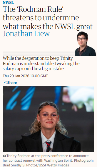 Allison Travis+FollowIs the ‘Rodman Rule’ Good for the NWSL?Trin Spin fans, what do you think about the new ‘Rodman Rule’ in the NWSL? Trinity Rodman just signed the biggest contract in women’s football history, but the league had to bend its own salary cap rules to keep her. Some say it’s a win for star power, others worry it’ll break the league’s competitive balance. Are we risking what makes the NWSL special just to keep our biggest names? #Sports #Soccer #NWSL00Share