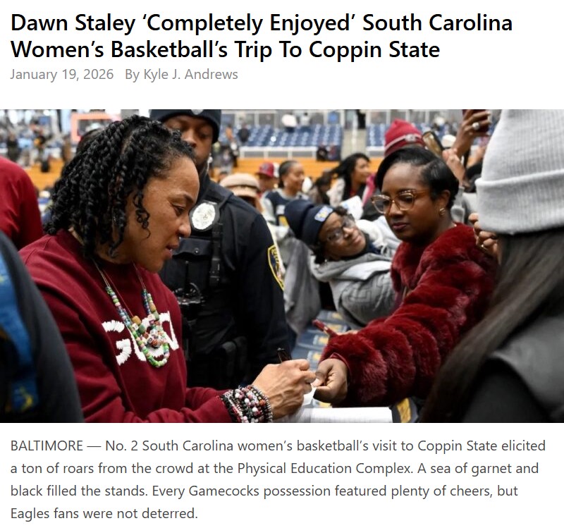 EchoingEagle+FollowSouth Carolina vs Coppin State: More than a gameThe energy in Baltimore was electric as South Carolina women’s basketball rolled into Coppin State, drawing a packed house and plenty of hometown pride. Coach Dawn Staley, who grew up in Philly, felt right at home among the rowhomes and city grit, and her presence brought a rare spotlight to Coppin’s campus. While the Gamecocks dominated on the court, the real win was for the community—fans, families, and HBCU awareness all came together for a day to remember. What moments from local sports have brought your community together like this? #Sports #SouthCarolina #CoppinState00Share