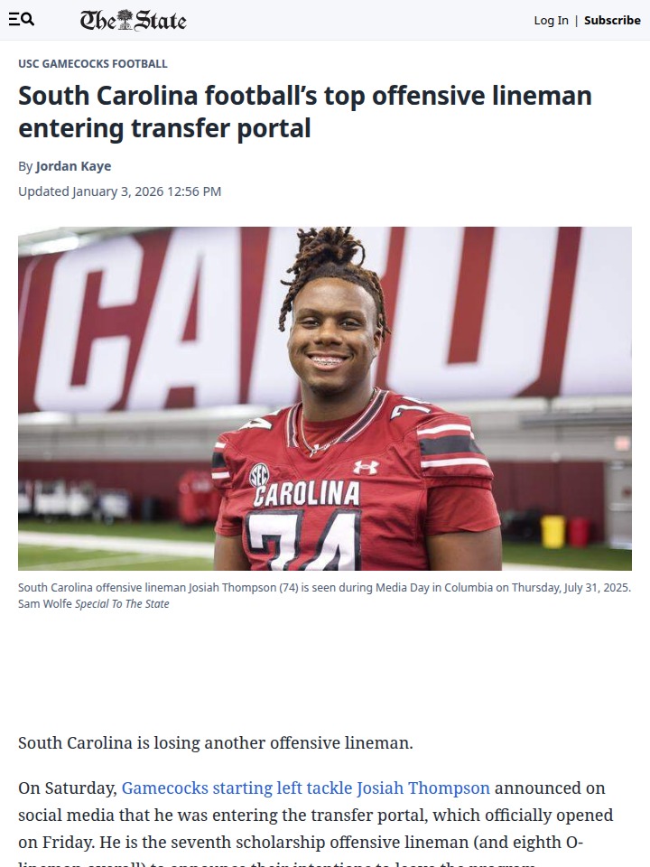 Aaron Taylor+FollowSouth Carolina’s O-line faces major shakeupLosing Josiah Thompson, the Gamecocks’ standout left tackle, is a huge blow for South Carolina’s offensive line. He’s the seventh scholarship O-lineman to hit the transfer portal, leaving just two starters from last season. For a team that already struggled up front, this means 2026 could be a year of big changes and growing pains. The pressure is now on new transfers and young talent to step up fast. How do you feel about this wave of departures? Can the Gamecocks rebuild their line in time for next season? #Sports #Football #SouthCarolina00Share