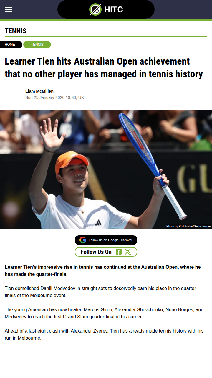 Kelly Jones+FollowLearner Tien Makes Aussie Open History!Wow, tennis fans—Learner Tien just pulled off something no one else has in Melbourne! The young American sensation crushed Medvedev in straight sets and is now the first male player born in 2005 to reach a Grand Slam quarter-final. Not only that, but Tien is the youngest American to make the last eight since Andy Roddick in 2001. Could he go even further than Roddick did? Next up: a huge clash with Zverev. The future is now! #Sports #Tennis #LearnerTien10Share
