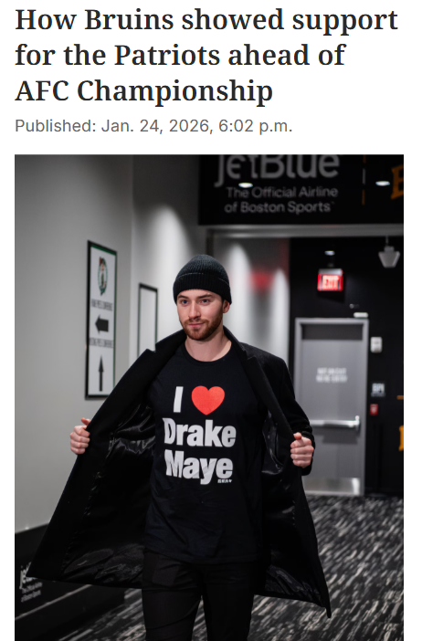 Martha Garza+FollowBruins rally behind Patriots before AFC showdownBoston’s sports scene just got even more united—Bruins players showed up for their big game against Montreal all rocking “I ♥ Drake Maye” shirts, giving a huge shoutout to the Patriots ahead of the AFC Championship. It’s awesome to see this kind of cross-team support, especially with the Patriots facing Denver for a shot at the Super Bowl. With Maye becoming a local favorite, this moment feels like a true celebration of New England pride. How do you feel about our teams backing each other up like this? Does it fire you up for Sunday’s game? #Sports #IceHockey #PatriotsVsBroncos10Share
