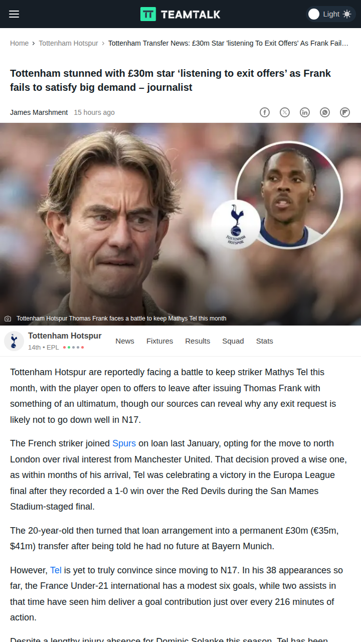 Jamie Mack+FollowTel Frustrated at Spurs: Exit Rumors SwirlLooks like Mathys Tel, aka the French Wonderkid, is getting restless at N17. After picking Spurs over the Red Devils and bagging a Europa League winner’s medal, Tel’s been mostly warming the bench behind Richarlison. Now, word is he’s open to offers this winter after being left out of the Champions League squad. But with Solanke and Kudus both injured, Thomas Frank isn’t keen to let him go. Is this just transfer window noise, or could we see a surprise move? #Sports #Soccer #Spurs00Share