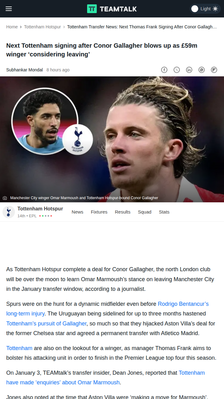 Timothy Thompson+FollowSpurs Eye Marmoush After Gallagher CoupBig moves brewing at Hotspur Way! After nabbing Conor Gallagher from under Villa’s nose, Spurs are now circling Man City’s Omar Marmoush. The Egyptian winger, frustrated by limited minutes behind Pep’s stacked attack, is reportedly open to a Premier League loan. With the Lilywhites desperate for more firepower and Villa also in the mix, could this be the next big North London vs Manchester transfer tug-of-war? Watch this space! #Sports #Soccer #Spurs00Share