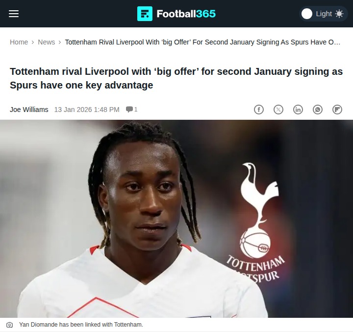 Maurice Miller+FollowSpurs Outbid Reds for Diomande?Looks like Tottenham are ready to go toe-to-toe with the Reds for RB Leipzig’s Yan Diomande! With King Klopp’s Liverpool eyeing a summer move, Spurs could swoop in this January and steal a march. The North Londoners already landed Gallagher, but could Diomande be the next big signing? This transfer battle is heating up, and Spurs’ urgency might just give them the edge over Liverpool. Thoughts on who needs him more? #Sports #Soccer #Spurs00Share