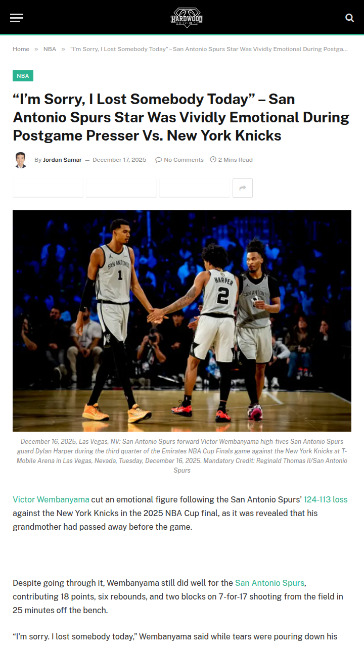 Edwin French+FollowVictor Wembanyama fights back tears after NBA Cup loss, reveals he “lost somebody today”Victor Wembanyama could barely get through his postgame presser after the Spurs’ NBA Cup loss to the Knicks. He answered one question, then started to tear up and said, “I’m sorry, I lost somebody today,” before taking one more question and walking off. Per reports, Wemby had just learned earlier in the day that his grandmother passed away in France, yet he still suited up and put up 18 points and 16 rebounds in the final. Basketball aside, you could see how much it all hit him at once. What was your reaction seeing that clip, and how do you feel about players trying to compete through something like this? #VictorWembanyama #Spurs #NBACup #NBA #Basketball 62Share