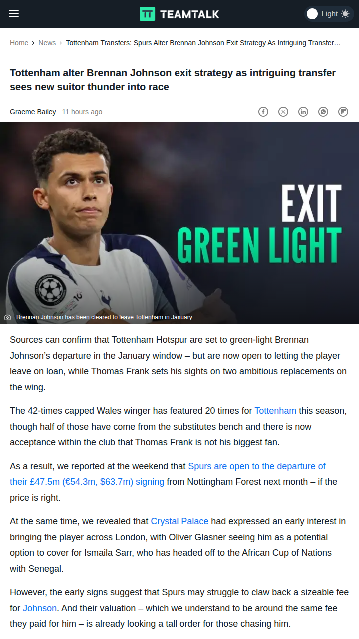 Malik Williams+FollowSpurs vs Thunder: Brennan Johnson Loan TwistLooks like the Lilywhites are shaking things up! Spurs are now open to letting Brennan Johnson leave on loan this January, with the Welsh winger struggling for minutes under Thomas Frank. The real twist? Bournemouth and Palace are circling, but Spurs fans are buzzing about who might come in next—Antoine Semenyo or even Leipzig’s Yan Diomande. Could this move help Johnson rediscover his spark and set up a bigger summer deal? Let’s hear your takes on this transfer chess match! #Sports #Soccer #Spurs00Share