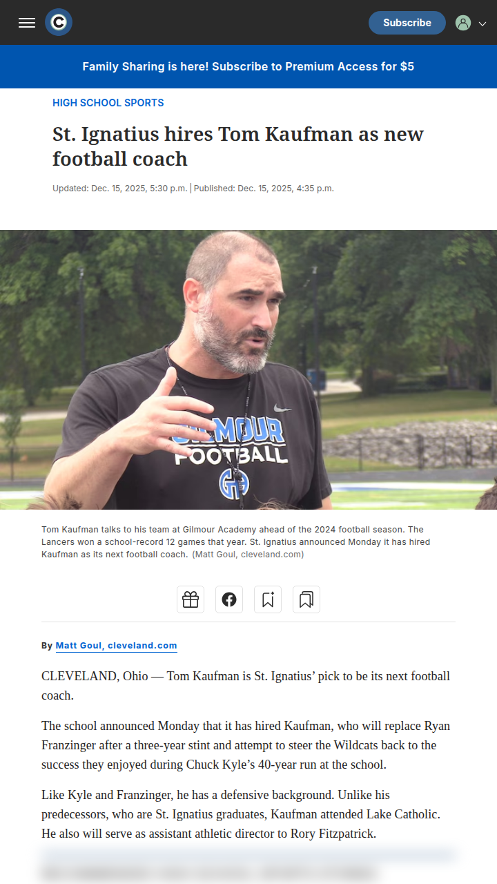 Chad Williams+FollowNew era for St. Ignatius footballSt. Ignatius is turning the page after a tough season, bringing in Tom Kaufman as the new head football coach. Kaufman’s track record—like leading Gilmour Academy to a record-breaking year and building Marietta College’s program—shows he’s all about culture, character, and results. He’s not just focused on wins, but on shaping young men who give back and lead with heart. With deep roots in Northeast Ohio, Kaufman is promising a program built on connection, discipline, and gratitude. How do you think this fresh start will impact the Wildcats and the community? #Sports #Football #StIgnatius00Share