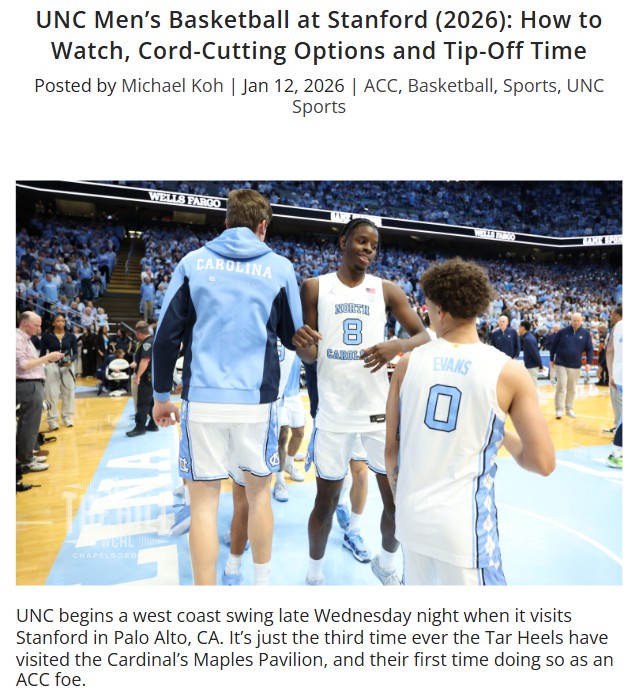 EchoingEagle+FollowHow to catch UNC vs Stanford without cableUNC’s rare trip to Stanford is coming up, and you don’t need cable to catch every moment. The Tar Heels are playing at Maples Pavilion for just the third time ever, and if you’re not making the cross-country journey, there are plenty of ways to tune in. Radio fans can listen locally or stream online, while TV viewers can catch the action on ACC Network. For cord-cutters, services like YouTube TV, Hulu TV, and Sling TV all carry ACC Network—just double-check your package. Who’s planning a late-night watch party? #Sports #UNC #Stanford00Share
