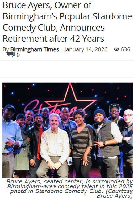 jimmy13+FollowStardome’s Bruce Ayers retires after 42 yearsAfter 42 years of laughter, Bruce Ayers is stepping away from Birmingham’s iconic Stardome Comedy Club. Ayers and his family turned Stardome into a comedy landmark, hosting legends like Sinbad, Steve Harvey, and Chris Rock, and giving countless up-and-comers their start. Now, the club is in new hands—Helium Comedy Clubs—but Ayers says the spirit of Stardome will live on. For so many in Birmingham, Stardome isn’t just a club; it’s a piece of the city’s heart. What’s your favorite Stardome memory, and what do you hope for its future? #Entertainment #Birmingham #Stardome00Share