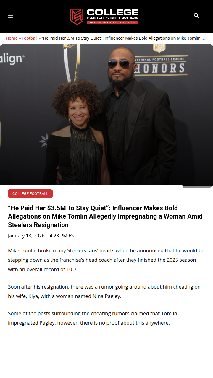 Jay Williams+FollowTomlin Resigns: Rumors Swirl in Steelers NationSteelers Nation, what a wild ride! Coach T’s resignation after a 10-7 season already had us reeling, but now the rumor mill is in overdrive. Allegations are flying about Mike Tomlin’s personal life, with some claiming a hush money payout over an alleged affair. There’s zero proof so far, but the story’s catching fire online. Through it all, Kiya Tomlin stands by her man, praising his character and legacy. Is this just offseason drama, or is there more to the story? #Sports #Football #Steelers10Share