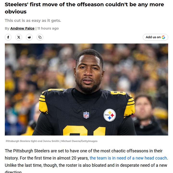 Amy Williams+FollowSteelers’ offseason shakeup: Smith out?Cutting Jonnu Smith could be the easiest—and smartest—move the Steelers make this offseason. After a season where Smith never quite fit in and failed to become the receiving threat Pittsburgh hoped for, letting him go frees up $7 million in cap space. With Darnell Washington stepping up and Pat Freiermuth still in the mix, there’s just no room to justify Smith’s contract. This feels like a no-brainer, especially as the team faces bigger changes ahead. What do you think—should the Steelers move on from Smith right away, or give him another shot? #Sports #Football #Steelers21Share