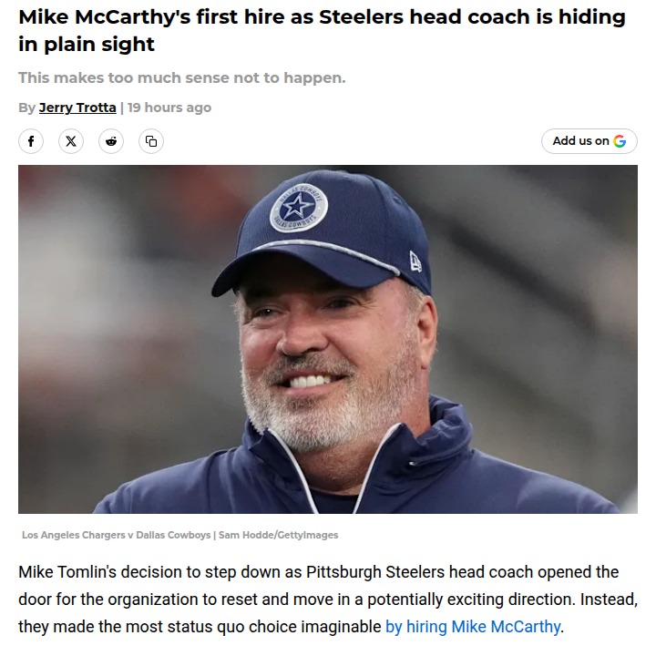 Chad Williams+FollowSteelers’ risky move: Is Mike McCarthy the answer?Pittsburgh just made a bold call, hiring Mike McCarthy as head coach instead of waiting for top candidate Chris Shula, who’s still in the playoffs. The urgency from Art Rooney II to fill the spot might cost the Steelers their December playoff magic—a hallmark under Mike Tomlin. McCarthy brings a Super Bowl ring and a solid record, but his recent stints ended after losing seasons. Some say he’s underrated, others worry he’s not the spark the Steelers need. What do you think—did Pittsburgh act too fast, or is McCarthy the right fit for the next era? #Sports #Football #Steelers01Share