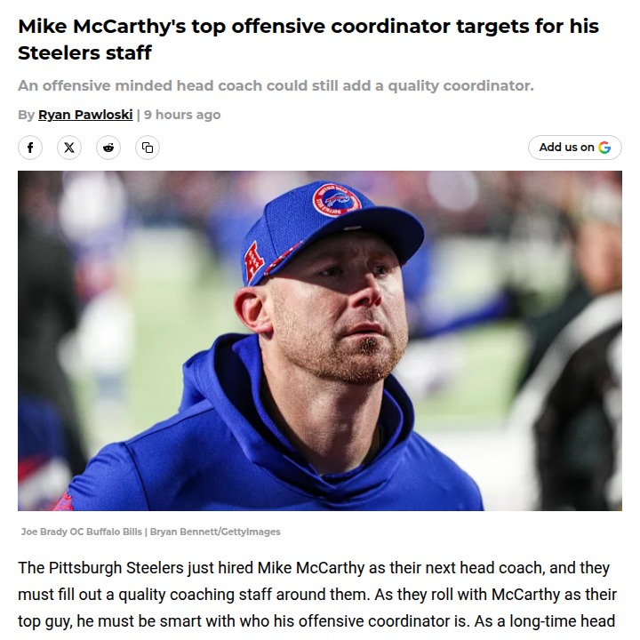 Jeffrey Armstrong+FollowSteelers fans: Who should run our offense?Mike McCarthy is in as the Steelers’ new head coach, and the buzz is all about who’ll take over as offensive coordinator. With Arthur Smith likely out, Pittsburgh has a real shot to shake things up. Names like Joe Brady, Kliff Kingsbury, and Brian Daboll are floating around—each could bring a totally different vibe to the offense. Would you rather see a proven play-caller or an up-and-coming mind? This hire could define the next era of Steelers football. Who do you think would be the best fit to spark our offense? #Sports #Football #SteelersNation00Share