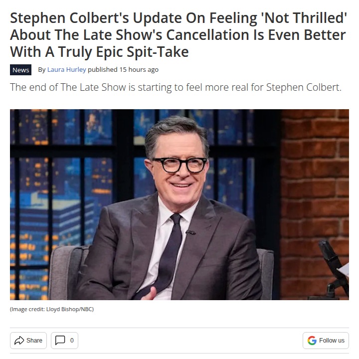 Victoria Garcia+FollowColbert’s Spit-Take on The Late Show’s End 😂Stephen Colbert just turned his feelings about The Late Show’s 2026 cancellation into comedy gold with a wild spit-take on Seth Meyers’ set! The fandom is split: some say Colbert’s keeping it light, others think he’s hiding real heartbreak. Was the spit-take a genuine reaction or just classic Colbert deflection? Either way, the drama’s real as the countdown to the finale begins! #Entertainment #TVSeries #StephenColbert11Share