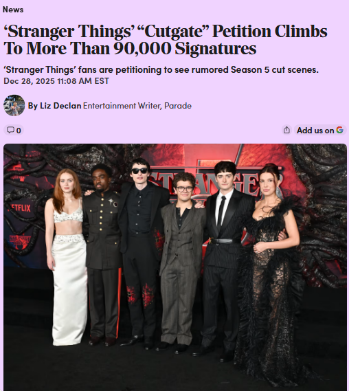 Brittany Rios+FollowStranger Things 'Cutgate' Drama Hits 90k+ 🚨Petition for Netflix to release the rumored 'Stranger Things' Season 5 Volume 2 cut scenes is blowing up—over 90,000 signatures and counting! The fandom is split: some are loving the new episodes, but others are furious about alleged missing Byler moments and a supposed fake-out death for Will. An anonymous source claims these scenes exist, but is this just classic fan hype or did Netflix really axe key moments? The debate is wild right now! #Entertainment #Movies #strangerthings00Share