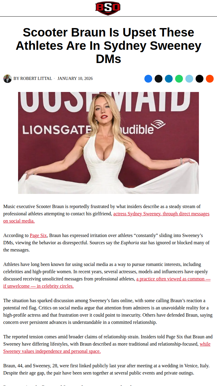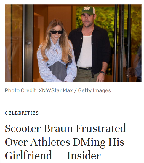Jenna Gonzales+FollowScooter Braun Sounds Off on Athletes DM DramaInsider buzz says Scooter Braun is losing patience with pro athletes sliding into Sydney Sweeney’s DMs. Even though Sydney’s shutting them down, the constant attention is reportedly testing their relationship. Fans, what’s your take—are these athletes crossing a line, or is this just part of dating in the spotlight? #Sports #ScooterBraun #SydneySweeney00Share