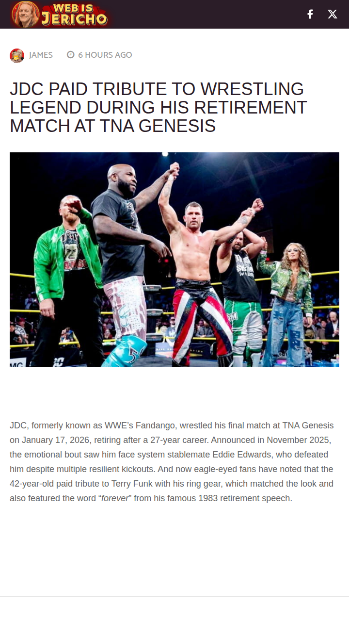 Kayla Mcconnell+FollowJDC’s Emotional Farewell: Funk Forever GearLongtime fans, did you catch JDC’s final showdown at TNA Genesis? The former Fandango went out in style, not just with a hard-fought match against Eddie Edwards, but by rocking ring gear that paid homage to hardcore icon Terry Funk—complete with the word “forever” from Funk’s legendary 1983 speech. After 27 years, JDC’s tribute was a classy nod to wrestling history and a reminder of how legends inspire the next generation. #Sports #Wrestling #TNAGenesis10Share