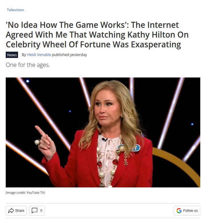 Caitlyn Morrow+FollowKathy Hilton’s Wheel of Fortune Chaos 😂Watching Kathy Hilton on Celebrity Wheel of Fortune was honestly wild. She kept breaking the rules, calling out letters already on the board, and didn’t seem to know how the game worked at all. Social media exploded with people cringing and laughing at her cluelessness. The best part? Her totally awkward moments with Vanna White and Ryan Seacrest trying to help her through. Is this the most iconic game show fail ever or what? #Entertainment #TVSeries #KathyHilton11Share