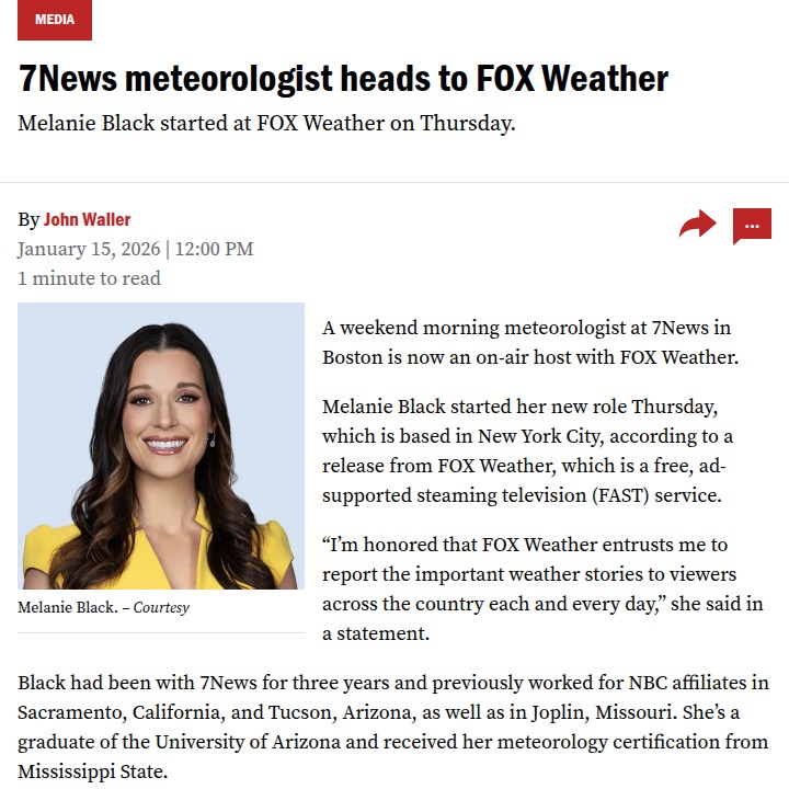 Caitlyn Morrow+FollowMelanie Black’s Big Move to FOX Weather 🌦️Did anyone see Melanie Black just left 7News Boston for FOX Weather in NYC? Fans are buzzing—some say she’s chasing bigger stories, others think it’s all about the streaming TV fame. But here’s the twist: will 7News ever be the same without her weekend energy? The weather team shakeup is real, and the fandom is already debating who’ll fill her shoes! #Entertainment #TVSeries #MelanieBlack00Share