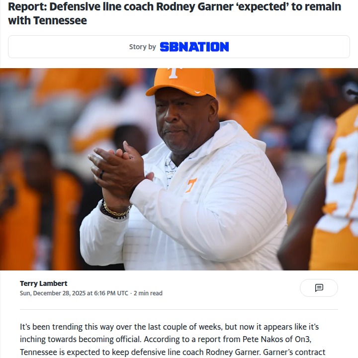 Aaron Taylor+FollowRodney Garner stays to shape Tennessee’s defenseRodney Garner isn’t going anywhere—he’s sticking with Tennessee as defensive line coach, even as the Vols head into a new era under Jim Knowles. Garner’s been a recruiting force and a mentor for some of the best defensive linemen to come through Knoxville, and his experience (over 35 NFL draft picks!) is hard to match. After a tough season, he’s already reloading with a strong 2026 class and is expected to tap the transfer portal for more talent. How do you feel about Garner’s impact on the Vols’ future? What’s your take on continuity vs. change in coaching? #Sports #Football #TennesseeFootball00Share