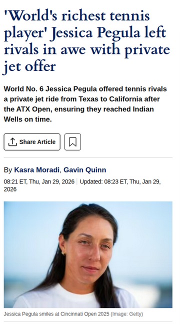 andersonkaren+FollowPegula’s Jet Move: Tennis Rivals ReactJessie Pegula, often dubbed the 'world’s richest tennis player,' just proved why she’s a fan favorite off the court too. After clinching the ATX Open, Pegula waited for the doubles final to finish and then flew her fellow competitors—Kessler, Zhang, Yue, and Blinkova—straight to Indian Wells on her private jet. Talk about sportsmanship! The gratitude from her peers was all over Instagram. Is this the classiest move on tour? #Sports #JessicaPegula #Tennis31Share