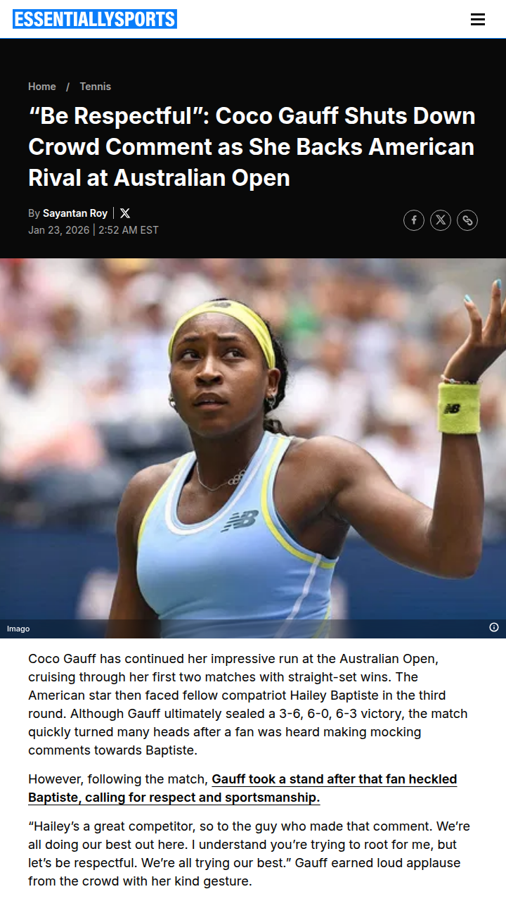 Stephen Herrera+FollowCoco Gauff Calls for Respect at AOGauff Nation, did you catch King Coco’s latest at the Australian Open? After a gutsy comeback against fellow American Hailey Baptiste, Gauff showed her class off the court too—shutting down a rude crowd comment and standing up for her rival. It’s moments like these that show why Coco’s not just a future legend for her game, but for her leadership. Can she keep this run going? Let’s discuss! #Sports #Tennis #CocoGauff90Share