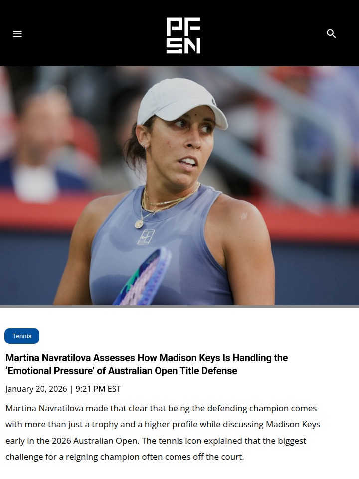 tammy84+FollowKeys Faces the Heat as Aussie Open ChampMadison Keys is feeling the heat Down Under as she defends her Australian Open crown. Tennis legend Martina Navratilova broke down how the real battle for Keys isn’t just on the court, but handling the emotional pressure and spotlight that comes with being the hunted. So far, Keys is showing poise, but with every round, the mental game gets tougher. Can she keep her cool against Krueger in round two? #Sports #Tennis #AustralianOpen00Share