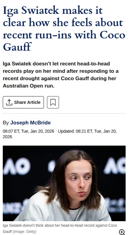 Kelly Jones+FollowSwiatek vs Gauff: Rivalry Heating Up at AOThe Iga Swiatek–Coco Gauff rivalry is getting spicy at the Australian Open! Even though Gauff has won four straight matches against Swiatek without dropping a set, the former World No. 1 says she’s not losing sleep over it. Swiatek is focused on treating every match as a new challenge, not letting the head-to-head define her. With both stars in top form, could this be the year Swiatek completes her Grand Slam set? #Sports #Tennis #AustralianOpen00Share